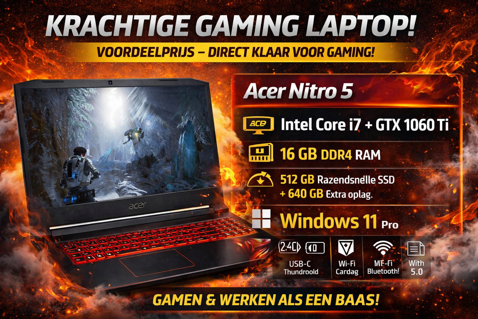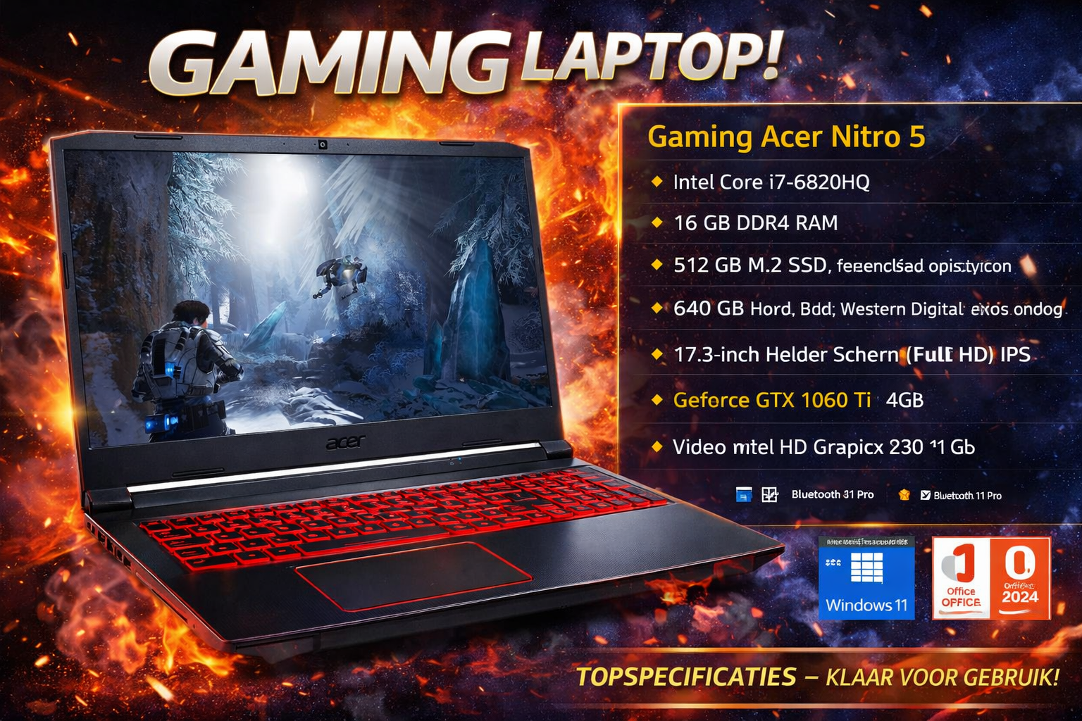 ZGAN 17.6 inch A Grade Gaming Acer Nitro 5 + Core i7 + 16 Gb + M2 SSD + HD + Startklaar + Windows 11 Pro + Office 2024